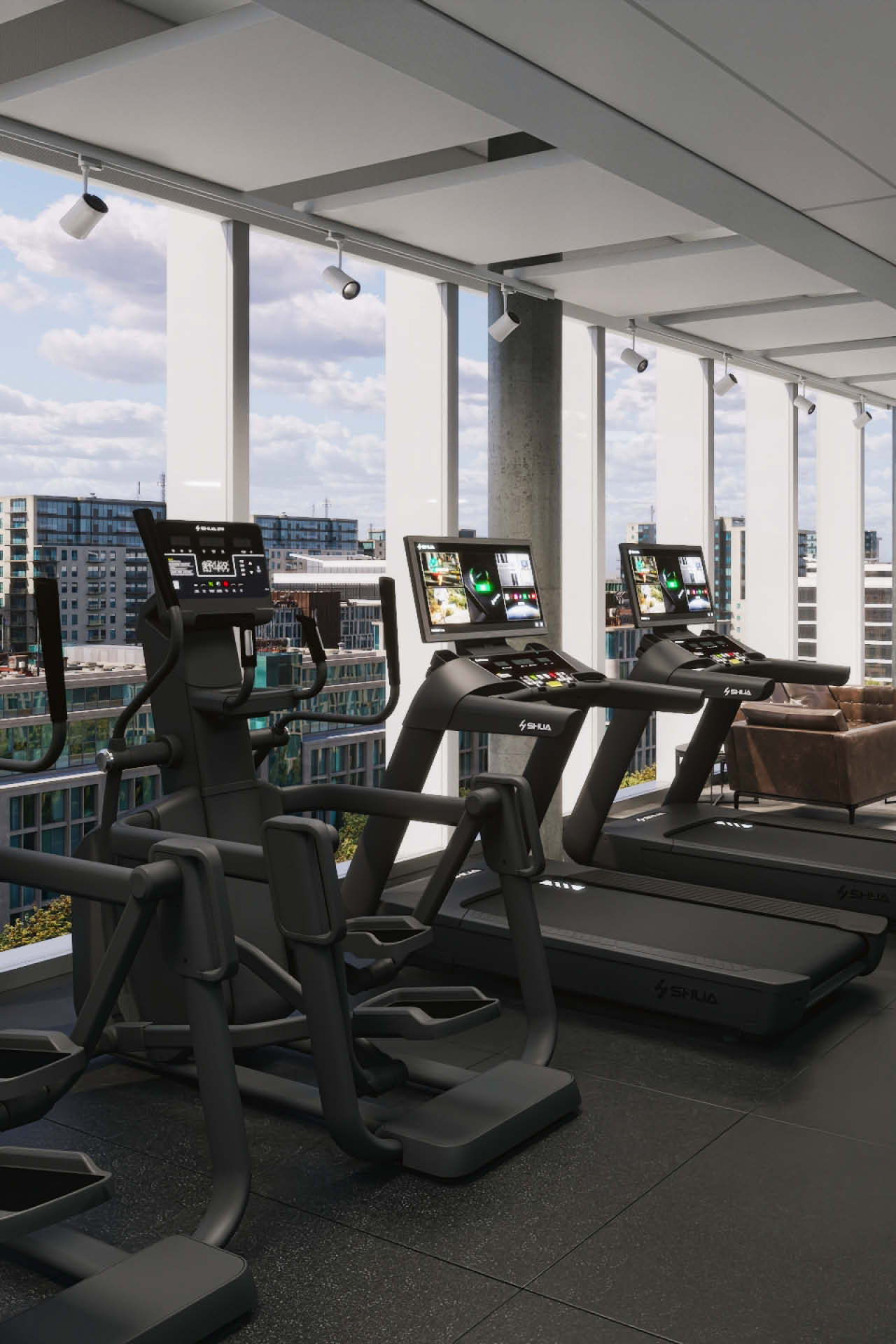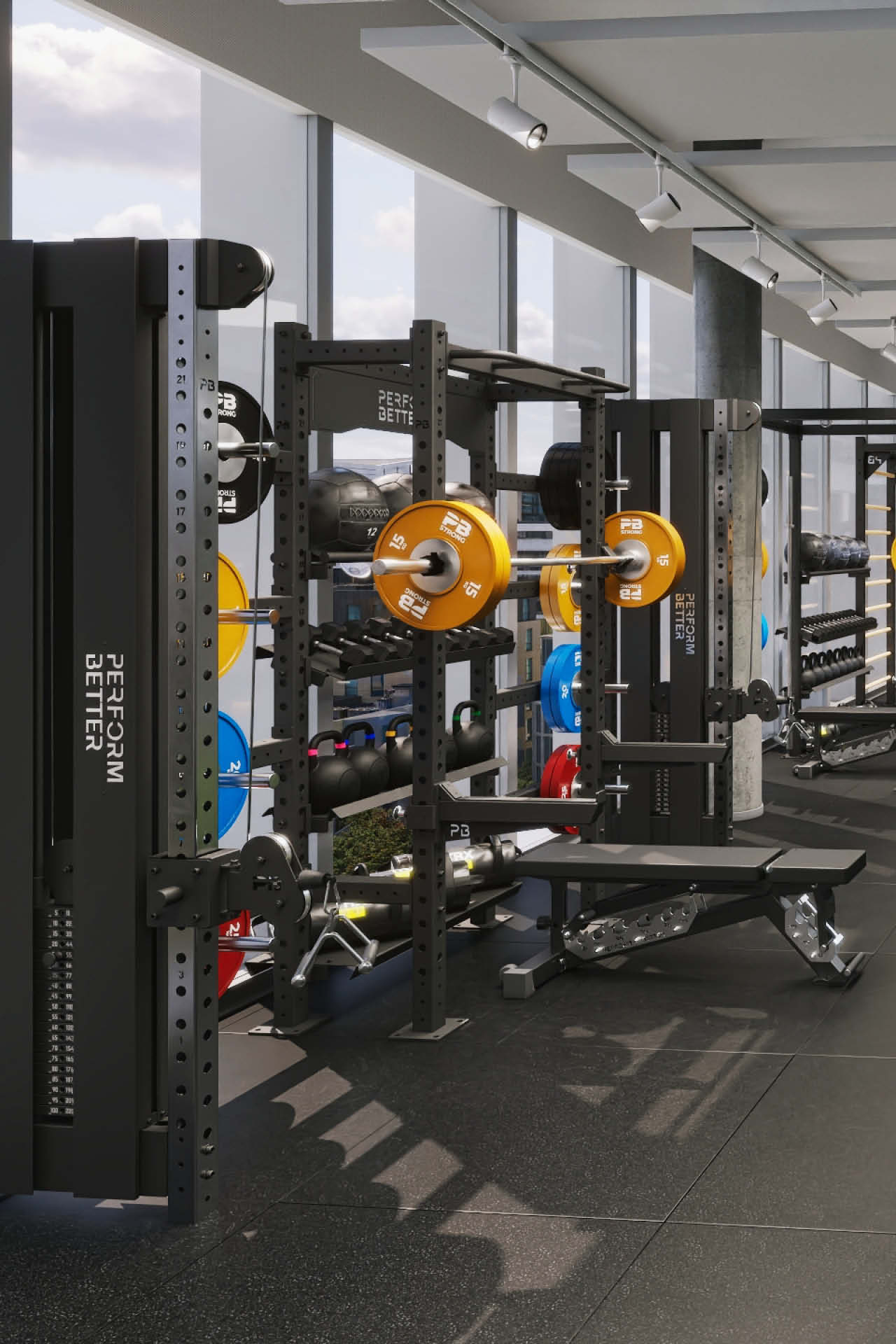 The training and therapy area was deliberately designed to allow both patients and therapists to work efficiently. Spacious, open areas facilitate movement exercises, manual techniques, and targeted strength and mobility training within a clearly structured workflow. Well-designed zones for rehabilitation, recovery training, and prevention ensure that each session can be tailored to individual needs and carried out effectively. In addition, the glass façade, which spans the entire training area, offers a stunning view over the rooftops of Nuremberg.